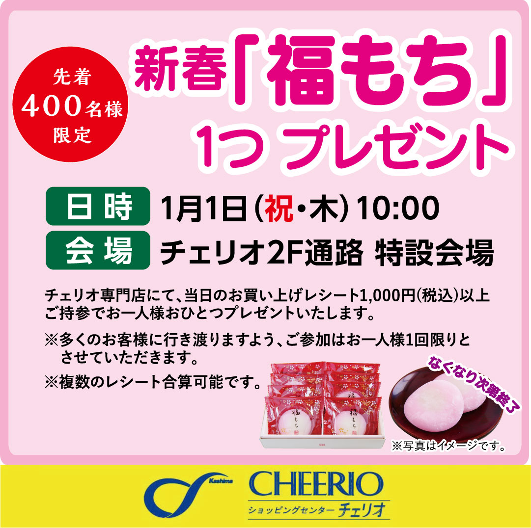 【日 時】 2025年1月1日(木祝)10:00~なくなり次第終了 【会 場】チェリオ2階通路 特設会場