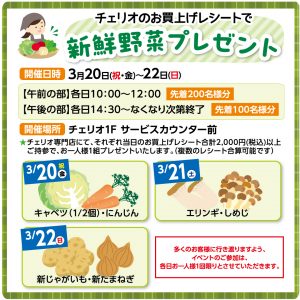 【3/20~22】チェリオお買上げレシートで新鮮野菜プレゼント