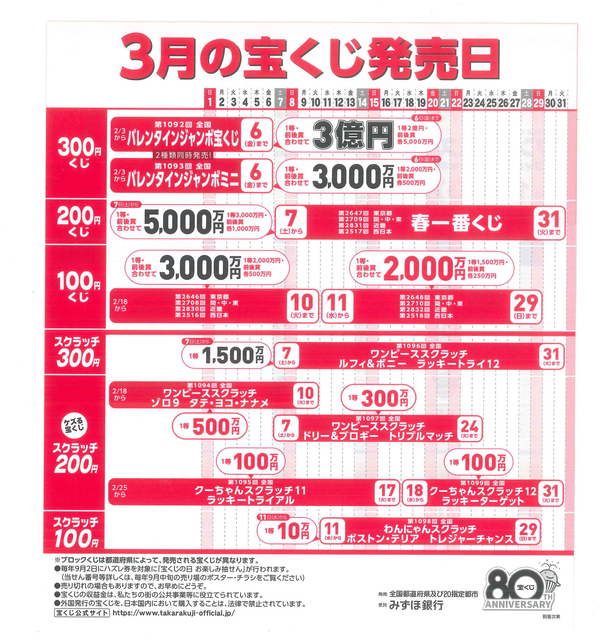 【宝くじ スケジュール】 ■年末ジャンボ 年末ジャンボの季節になりました。 1等 前後賞合わせて 10億円